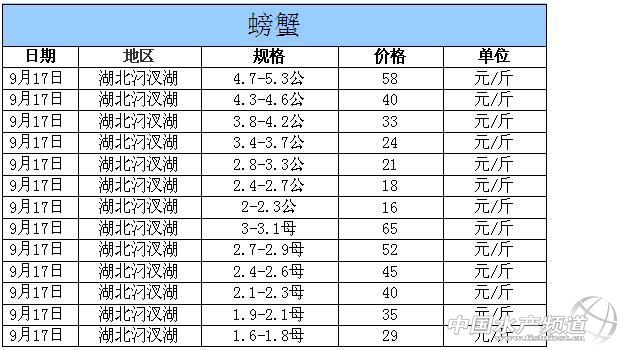 中國水產(chǎn)頻道獨家報道,據(jù)網(wǎng)友提供消息,2014年9月17日湖北汈汊湖主產(chǎn)區(qū)河蟹價格行情如下: 湖北漢川汈汊湖河蟹信息由湖北漢川天歌螃蟹養(yǎng)殖專業(yè)合作社曾先生(13508632620)提供,由于價格波動及訂貨量影響,以上價格為行情價格,實際價格請聯(lián)系電話。 |