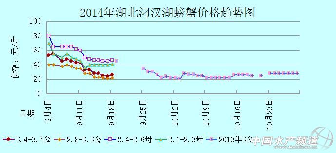 中國(guó)水產(chǎn)頻道獨(dú)家報(bào)道,據(jù)網(wǎng)友提供消息,2014年9月18日湖北汈汊湖主產(chǎn)區(qū)河蟹價(jià)格行情如下: 湖北漢川汈汊湖河蟹信息由湖北漢川天歌螃蟹養(yǎng)殖專(zhuān)業(yè)合作社曾先生(13508632620)提供,由于價(jià)格波動(dòng)及訂貨量影響,以上價(jià)格為行情價(jià)格,實(shí)際價(jià)格請(qǐng)聯(lián)系電話。 |