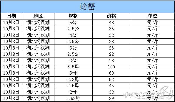 中國水產(chǎn)頻道獨家報道,據(jù)網(wǎng)友提供消息,2014年10月8日湖北汈汊湖主產(chǎn)區(qū)河蟹價格行情如下: 湖北漢川汈汊湖河蟹信息由湖北漢川天歌螃蟹養(yǎng)殖專業(yè)合作社曾先生(13508632620)提供,由于價格波動及訂貨量影響,以上價格為行情價格,實際價格請聯(lián)系電話。 |
