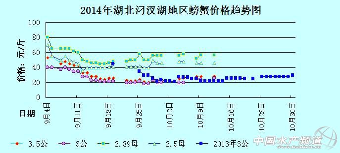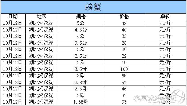 中國水產(chǎn)頻道獨家報道,據(jù)網(wǎng)友提供消息,2014年10月12日湖北汈汊湖主產(chǎn)區(qū)河蟹價格行情如下: 湖北漢川汈汊湖河蟹信息由湖北漢川天歌螃蟹養(yǎng)殖專業(yè)合作社曾先生(13508632620)提供,由于價格波動及訂貨量影響,以上價格為行情價格,實際價格請聯(lián)系電話。 |