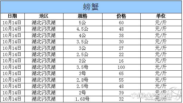 中國水產頻道獨家報道,據網友提供消息,2014年10月14日湖北汈汊湖主產區(qū)河蟹價格行情如下: 湖北漢川汈汊湖河蟹信息由湖北漢川天歌螃蟹養(yǎng)殖專業(yè)合作社曾先生(13508632620)提供,由于價格波動及訂貨量影響,以上價格為行情價格,實際價格請聯系電話。 |