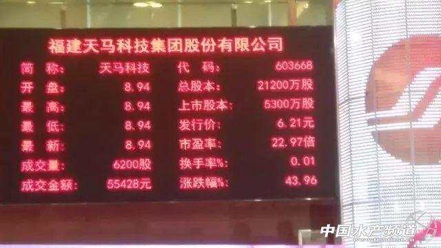 | 文/水產(chǎn)前沿雜志 羅少蒙 中國(guó)水產(chǎn)頻道獨(dú)家報(bào)道,2017年1月17日,福建天馬科技集團(tuán)股份有限公司(以下簡(jiǎn)稱天馬科技[603668])正式上市,發(fā)行價(jià)為6.21元/股,開盤后迅速拉升至44%,截至發(fā)稿前,其報(bào)價(jià)為8.94元/股,達(dá)到上市首日漲幅限制。