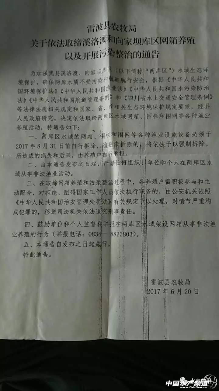 文/ 中國水產(chǎn)頻道 羅丹、水產(chǎn)前沿 吳佳輝 中國水產(chǎn)頻道獨家報道,7月12日,一則《雷波金沙江網(wǎng)箱撤除一刀切,蠻橫執(zhí)法,養(yǎng)殖戶生不如死》的新浪微博引起了《水產(chǎn)前沿》的關(guān)注。微博提到,6月22日,近百戶雷波金沙江網(wǎng)箱戶接到8月31日前需拆除全部7000口網(wǎng)箱的通知,隨后不允許運飼料車通行、斷電斷水等野蠻執(zhí)法,以及數(shù)百近千萬的貸款讓養(yǎng)殖戶感覺生不如死。 微博全文如下: 我們是涼山州雷波縣的全體金沙江網(wǎng)箱全體漁業(yè)養(yǎng)殖戶,由雷波縣政府2014年提出的《雷波縣現(xiàn)代漁業(yè)發(fā)展規(guī)劃》規(guī)劃,得到水務(wù),農(nóng)牧,招商引資等部門同意并以四川龍頭飼料企業(yè)牽頭合作,以“公司+農(nóng)戶”的合作思路,帶動兩庫(溪洛渡水庫、向家壩水庫)地區(qū)農(nóng)民增收致富的漁業(yè)發(fā)展的目標,并引入有經(jīng)驗的外來水產(chǎn)養(yǎng)殖戶帶領(lǐng)當(dāng)?shù)厝龒{移民共同養(yǎng)殖脫貧致富的相關(guān)政策,于2014年在雷波金沙江水域進行合服當(dāng)?shù)卣叩木W(wǎng)箱養(yǎng)殖作業(yè)。 目前每位養(yǎng)殖戶投入資金最少的有100萬左右,最多的高達800萬左右。經(jīng)過兩年大量的資金投入(估計區(qū)域內(nèi)所有網(wǎng)箱及魚苗投入2-3億人民幣)和艱苦施工,目前基礎(chǔ)設(shè)施基本完善并進入正式養(yǎng)殖生產(chǎn)運營工作,全體養(yǎng)殖戶共投入魚苗(美國加州鱸魚,斑點叉尾,鱘魚,四大家魚等)魚種約1億尾,養(yǎng)殖的魚類大多是外來名貴魚種,營養(yǎng)價值高,生長周期慢,大多要經(jīng)過1-3年的漫長生長周期,現(xiàn)目前正是魚類生長旺季,預(yù)計在8月底達到上市標準的成魚能到達5-15%,正抓緊時機進行半成品魚類的生產(chǎn)作業(yè)。6月份是魚苗引進的最后時機,養(yǎng)殖戶在2017年6月22日前將全部魚苗引進入箱,以美國加州鱸魚居多,占所有引進魚苗的95%,魚苗市場價格達到0.7元每尾,區(qū)域內(nèi)共引進約3千萬尾,魚苗投入高達2千余萬元。 我們歷經(jīng)磨難飽經(jīng)風(fēng)霜,希望在即,終于可以盼來初見成效的喜悅,但2017年6月22日雷波政府和漁業(yè)相關(guān)部門在毫無前兆的情況下召集所有養(yǎng)殖人員召開了“金沙江網(wǎng)箱8月31日強制性撤除”的相關(guān)會議,漁民頓時悲痛欲絕,生不如死的感覺。并在通知撤箱會議前的6月21日下午在進入雷波必經(jīng)之路強行攔下運輸飼料的車輛,造成養(yǎng)殖戶蒙受巨大損失(鱸魚是外來肉食性動物,在沒有投餌后會自相殘殺,大吃小情況非常嚴重)。7月5日紀檢委和檢察院召集大家召開了相關(guān)的法紀宣傳大會,以種種違法亂紀的行為威脅養(yǎng)殖戶在8月31日前自行撤箱,所有半成品和魚苗要求8月31日前自行處理解決,并明確沒有任何政府或國家扶持和補償,7月6日后又不允許任何裝有飼料的貨車通行并扣押,造成大多養(yǎng)殖戶的魚類斷料斷糧,損失不可估量。7月7日早上又在沒有任何通知情況下斷電斷水,養(yǎng)殖戶不僅生產(chǎn)受阻,生活舉步維艱,強行撤箱后我們將背負高額的銀行和民間貸款,還有大量飼料欠款,給我們帶來了沉重的心里壓力,甚至有把生命留在金沙江的準備。 我們本是安分守己的公民,下崗職工,三峽移民,退伍軍人,失地農(nóng)民,為了給家人更好的生活,懷著夢想,我們不惜高額貸款房屋低價抵押進行生產(chǎn)養(yǎng)殖,我們靠的是辛勤勞作埋頭苦干,經(jīng)受無數(shù)次8級以上狂風(fēng),日曬雨淋,長期不能與家人孩子見面,任何困難我們自己面對,樂觀積極,如今的強拆我們只有面臨滅頂之災(zāi),傾家蕩產(chǎn),家破人亡,背負高額的債務(wù)。當(dāng)?shù)卣笪覀冏孕薪鉀Q魚的銷路問題,我們無法解決,鱸魚必須9兩以上才能上市,低于9兩沒有人收購,目前90%的魚都達不到上市標準,因飼料價格猛漲成本投入不斷提高,即使少量能達到上市標準其它魚類也是虧損銷售,經(jīng)過兩年的養(yǎng)殖半數(shù)養(yǎng)殖戶都在嚴重虧損狀態(tài)。剛進回的魚苗正直生長時機,每天大量的飼料資金投入,現(xiàn)在通過各方渠道全國都找不到需要苗子的買家。政府招商引資來的飼料公司因即將的撤箱消息也終止與我們的合作,不再予以我們飼料資金上的支持,并強烈要求我們歸還先前的飼料欠款,魚不到養(yǎng)殖周期,無法上市,我們真的是無能為力,欲哭無淚。鱸魚,斑點叉尾等本是外來肉食性魚類,若將此等魚類放入金沙江流域?qū)⑹菍ι鷳B(tài)帶來毀滅性的破壞,這些不僅是我們考慮的問題,也是職能部門應(yīng)該深思的問題。 我們也愿意積極支持和響應(yīng)國家環(huán)保政策,也希望為子孫后代留下美好的環(huán)境。一旦強拆我們將蒙受巨大的經(jīng)濟財產(chǎn)損失,我們真切的希望國家政府職能部門能再次給我們機會,我們只有最樸實的請求:我們只希望用我們自己的雙手努力改變現(xiàn)狀,盡快將網(wǎng)箱內(nèi)的所有魚類養(yǎng)大上市,減少因國家環(huán)保要求給自己帶來的慘痛損失,我們將盡量不給國家添加經(jīng)濟負擔(dān),希望省督查領(lǐng)導(dǎo)實地考察當(dāng)?shù)卣欠裼幸坏肚小⑿U橫執(zhí)法等違規(guī)行為。同時也希望媒體部門和政府職能部門領(lǐng)導(dǎo)干部能和我們一起在江面生活幾天做到真正了解民情,了