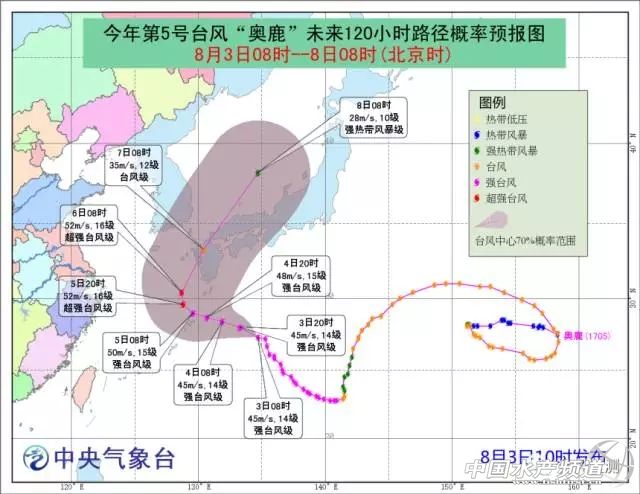 第5號臺風(fēng)“奧鹿”最新消息: 葵花-8號衛(wèi)星2日16時50分?jǐn)z得的奧鹿的臺風(fēng)眼 葵花-8號衛(wèi)星3日08時20分?jǐn)z得的奧鹿的臺風(fēng)眼 3日08時,“奧鹿”中心位于北緯27.3°,東經(jīng)134.7°(距離日本東京南偏西方向約1045公里),中心最低氣壓950百帕,近中心最大風(fēng)速45米/秒(14級風(fēng),強臺風(fēng)級)。 預(yù)計,“奧鹿”將以每小時10-15公里左右的速度向北偏西方向移動,強度變化不大。 奧鹿的動態(tài)云圖(時間段3日1時00分至7時30分),奧鹿今晨開始進入眼墻替換過程。 昨夜今晨,“奧鹿”開始進入眼墻替換過程,待此完成,它的強度有望再度拔高。目前預(yù)計它將于6號前后進入我國東海海域,隨后在128°附近北上,在達到最西點(也就是轉(zhuǎn)向前),它的強度將達到最巔峰,可能成為今年西北太平洋首個超強臺風(fēng)。 目前,“奧鹿”已進入它生命史的第13天,未來五天內(nèi),它仍將活躍在西北太平洋。它將很有可能創(chuàng)造近66年來西北太平洋臺風(fēng)生命史記錄。 中央氣象臺發(fā)布的1705“奧鹿”未來移動路徑概率圖 第11號臺風(fēng)“尼格” 今年第11號臺風(fēng)8月2日上午生成,3日08時,其中心位于距離日本東京東偏南方向約2565公里的海面上,也就是北緯27.0°,東經(jīng)164.8°,中心最低氣壓998百帕,中心附近最大風(fēng)速18米/秒(8級,熱帶風(fēng)暴級)。 預(yù)計,“尼格”將以每小時10公里左右的速度向北偏西方向移動,未來對我國無影響。 中央氣象臺發(fā)布的1711“尼格”未來移動路徑概率圖 |