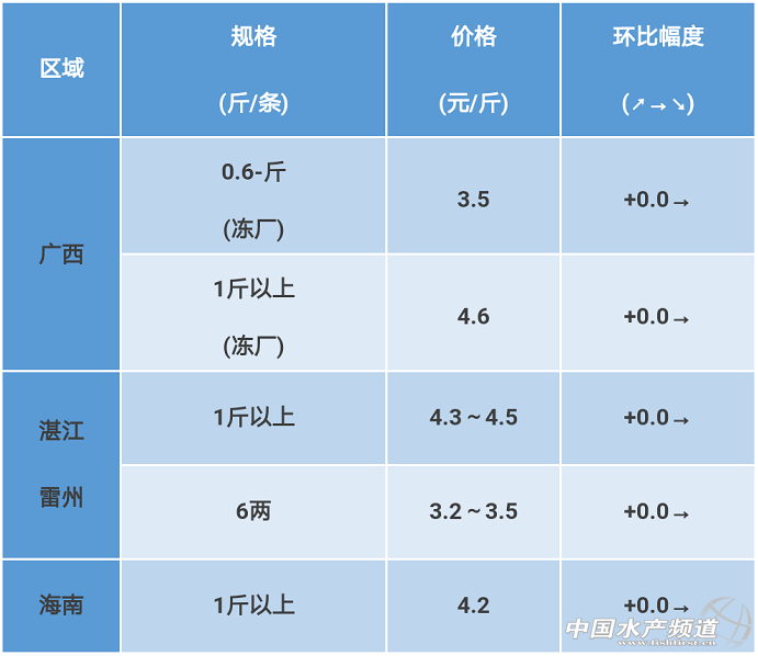 湛江區(qū)域:本周魚價與上周持平,維穩(wěn)。