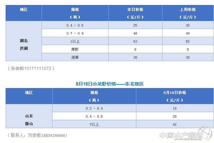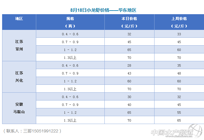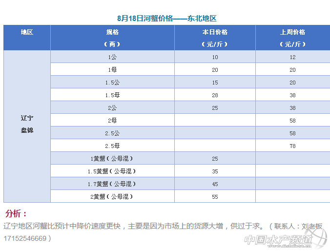 中國水產(chǎn)頻道獨家報道, 文/水產(chǎn)前沿實習(xí)編輯 何鴻浩 部分地區(qū)河蟹即將上市,一些水產(chǎn)商行已經(jīng)開始籌備河蟹上市計劃。華東地區(qū)預(yù)計在9月份上旬部分上市;華中地區(qū)預(yù)計在9月份下旬部分上市。近期市場主要為小規(guī)格蟹以及六月黃為主。而小龍蝦方面,價格變動并不大,一直處于較高價位。有報道表示,小龍蝦價格居高不下已經(jīng)影響到了整個產(chǎn)業(yè)鏈發(fā)展,尤其是餐飲業(yè)受到一定影響。 今日,筆者向各個地區(qū)的水產(chǎn)商行了解了一部分市場價格以及他們對市場的看法以供廣大養(yǎng)殖戶參考。 |