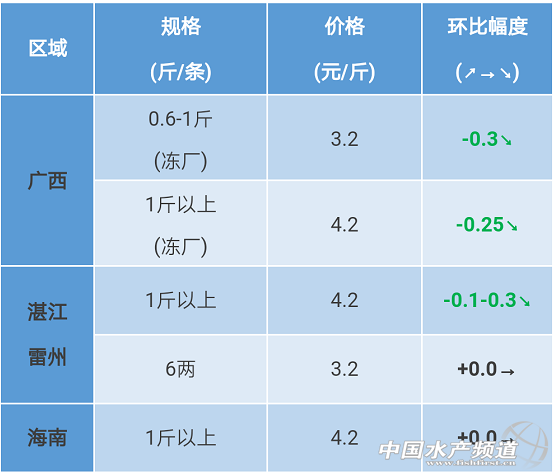 摘要: 廣西區(qū)域:受封海期結(jié)束,海捕海鮮大量上市的沖擊,羅非魚價格比上周下跌較大,凍廠0.6-1下跌0.3元/斤,一斤以上的下跌0.25元/斤。湛江、海南區(qū)域:整體與上周持平,高溫期未過,魚價不會有很大漲幅,養(yǎng)殖戶恐死魚出魚, ...
