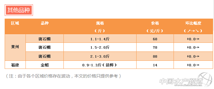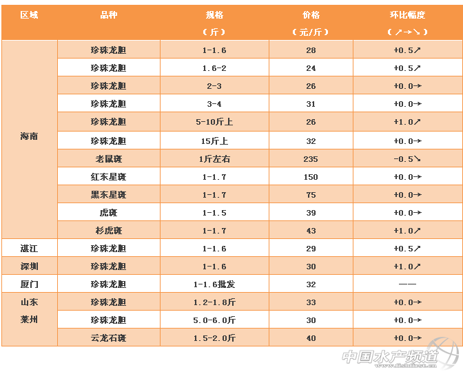 中國水產(chǎn)頻道獨家報道, 文/ 海南晨海水產(chǎn)有限公司 萊州明波水產(chǎn)有限公司 水產(chǎn)前沿 吳佳輝 養(yǎng)殖要豐產(chǎn),更要豐收 石斑、斑石鯛 塘頭最新報價周四見! 石斑魚 雖然本周珍珠龍膽的價格基本維穩(wěn),不過,業(yè)內(nèi)人士預(yù)測,珍珠龍膽的價格還存在一定的上漲空間。原因是一方面海南尚處于新舊魚銜接不上的階段;另一方面湛江的珍珠龍膽上市量少,促使珍珠龍膽的價格上漲,后市看漲。與珍珠龍膽的價格平民不同,老鼠斑等高端石斑魚卻因為進入7月份,宴席等減少,作為主供酒店的品種,價格有一定幅度的下滑。 石斑魚苗 本周的石斑魚苗,價格與上周差異不大。 |