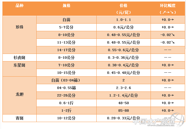 中國(guó)水產(chǎn)頻道獨(dú)家報(bào)道, 文/ 海南晨海水產(chǎn)有限公司 萊州明波水產(chǎn)有限公司 水產(chǎn)前沿 吳佳輝 養(yǎng)殖要豐產(chǎn),更要豐收 石斑、斑石鯛 塘頭最新報(bào)價(jià)周四見(jiàn)! 石斑魚(yú) 本周石斑魚(yú)2-3斤的下跌幅度比較大,原因是本周此規(guī)格的魚(yú)上市量(存塘量)比較高,而市場(chǎng)需求量不高。業(yè)內(nèi)人士表示,每年石斑魚(yú)在某個(gè)階段總是有某個(gè)規(guī)格的魚(yú)價(jià)會(huì)比較低,但并非某個(gè)規(guī)格的魚(yú)價(jià)會(huì)持續(xù)走低,這與市場(chǎng)的供求關(guān)系有關(guān)。而規(guī)格5斤以上的成魚(yú)今年的魚(yú)價(jià)難跌,原因是當(dāng)前這個(gè)規(guī)格的魚(yú)存塘量少。 石斑魚(yú)苗 本周杉虎斑孵化量減少,其它的沒(méi)什么太大的變化。 其他品種 。ㄗⅲ河捎诟鱾(gè)區(qū)域價(jià)格存在波動(dòng),本文的價(jià)格只提供參考) 相關(guān)鏈接 石斑魚(yú)上市量增加,8月價(jià)格或持穩(wěn) | 8月6日全國(guó)石斑魚(yú)·斑石鯛·海鱸價(jià)格播報(bào) 石斑魚(yú)上市量增加,8月份價(jià)格或持穩(wěn),杉虎斑降價(jià)3元/斤,斑石鯛上漲3元/斤丨8月13日全國(guó)石斑魚(yú)·斑石鯛·海鱸價(jià)格播報(bào) 新舊魚(yú)銜接不上,珍珠龍膽價(jià)格后市看漲 | 8月17日全國(guó)石斑魚(yú)·斑石鯛價(jià)格播報(bào) 漲10元/斤!這些石斑魚(yú)品種價(jià)格又上漲了!8月24日全國(guó)石斑魚(yú)·斑石鯛價(jià)格播報(bào) 價(jià)格親民需求大,不分地區(qū)不分規(guī)格,珍珠龍膽全面上漲,后市持續(xù)看好 | 8月31日全國(guó)石斑魚(yú)·斑石鯛價(jià)格播報(bào) 公告 中國(guó)水產(chǎn)頻道會(huì)持續(xù)收集和發(fā)布海鱸、石斑商品魚(yú)行情信息,發(fā)布的行情信息會(huì)經(jīng)過(guò)嚴(yán)格審核,最新行情爆料請(qǐng)與筆者聯(lián)系(添加微信號(hào)wxid_f4cer4azkid422或者發(fā)送郵箱wjh@fishfirst.cn)。 轉(zhuǎn)載聲明 本文為“水產(chǎn)前沿”獨(dú)家稿件,版權(quán)合作,敬請(qǐng)聯(lián)系wx@fishfirst.cn。 未獲書(shū)面許可,一律禁止轉(zhuǎn)載!謝謝合作! |