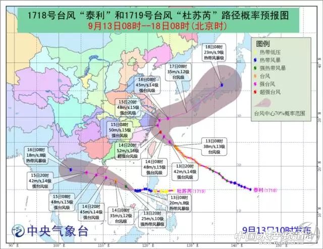 | 中國水產(chǎn)頻道綜合整理報道, 葵花-8號衛(wèi)星9月13日凌晨4時30分監(jiān)測到的18號臺風(fēng)“泰利”和19號臺風(fēng)“杜蘇芮”:“泰利”的外圍云系已開始影響浙閩沿海地區(qū),“杜蘇芮”基本擺脫菲律賓地形影響,西側(cè)和南側(cè)對流爆發(fā)顯著,強度將迅速增強 1718號臺風(fēng)“泰利”動態(tài)水汽云圖(時間:9月13日22時30分至9月13日04時30分) 1719號臺風(fēng)“杜蘇芮”動態(tài)水汽云圖(時間:9月13日222時30分至9月13日04時30分):“杜蘇芮”中心已經(jīng)進入南海,整體環(huán)流基本擺脫了菲律賓地形的影響,雖然東北象限高空仍受“泰利”對它的風(fēng)切影響,但西側(cè)和南側(cè)高空出流明顯加大,預(yù)計“杜蘇芮”強度即將迎來猛烈爆發(fā)期 中央氣象臺13日10時繼續(xù)發(fā)布臺風(fēng)橙色預(yù)警 今年第18號臺風(fēng)“泰利”的中心今天(13日)上午10點鐘位于浙江象山東南方約700公里的西北太平洋洋面上,就是北緯24.3度、東經(jīng)126.0度,中心附近最大風(fēng)力有13級(38米/秒),中心最低氣壓為965百帕,七級風(fēng)圈半徑200-350公里,十級風(fēng)圈半徑120公里,十二級風(fēng)圈半徑60-80公里。 9月13日8時中央氣象臺發(fā)布第18號臺風(fēng)“泰利”、第19號臺風(fēng)“杜蘇芮”路徑 預(yù)計,“泰利”將以每小時15-20公里的速度向西北方向移動,強度繼續(xù)加強,最強可達強臺風(fēng)級或超強臺風(fēng)級(14-16級,45-52米/秒),將于今天傍晚進入東海東南部,逐漸向浙江沿?拷,可能于15日在浙江北部一帶沿海登陸(臺風(fēng)級或強臺風(fēng)級,13-15級,40-48米/秒);也有可能在浙江中北部近海北上,然后轉(zhuǎn)向東北方向移去。 9月13日14時中央氣象臺發(fā)布第18號臺風(fēng)“泰利”路徑 大風(fēng)預(yù)報:13日14時到14日14時,長江口區(qū)、上海沿海、杭州灣,浙江沿海、福建沿海、東海大部、臺灣海峽、臺灣以東洋面將有7-8級大風(fēng),其中東海中南部和臺灣以東洋面的部分海域風(fēng)力可達9-11級,“泰利”中心經(jīng)過的附近海域風(fēng)力可達12-15級,陣風(fēng)16-17級。 降水預(yù)報:13日14時到14日14時,其中臺灣北部等地的部分地區(qū)有大雨或暴雨,臺灣北部局地有大暴雨(100~130毫米)。 第19號臺風(fēng)“杜蘇芮”將達強臺風(fēng)14級 今年第19號臺風(fēng)“杜蘇芮”(熱帶風(fēng)暴級)的中心今天上午10點鐘位于海南三亞東偏南方約870公里的南海海面上,就是北緯14.8度、東經(jīng)116.8度,中心附近最大風(fēng)力有8級(20米/秒),中心最低氣壓為995百帕,七級風(fēng)圈半徑160-180公里。 預(yù)計,“杜蘇芮”將以每小時20公里左右的速度向西偏北方向移動,強度逐漸加強,最強可達臺風(fēng)級或強臺風(fēng)級(13-14級,38-45米/秒),逐漸向海南南部沿海靠近,將于14日夜間到15日上午在這一帶沿海登陸(臺風(fēng)級或強臺風(fēng)級,13-14級,38-42米/秒);也有可能掠過海南南部海面,并于15日晚上在越南北部沿海登陸。 大風(fēng)預(yù)報:13日14時到14日14時,海南東部和南部沿海、南海中部和北部有7-9級大風(fēng),“杜蘇芮”中心經(jīng)過的附近海域風(fēng)力可達10-13級.,陣風(fēng)14-15級。 降水預(yù)報:13日14時到14日14時,海南島東部有大雨(25-40毫米)。 國家防總副總指揮、水利部部長部署防臺防汛 昨天,國家防總副總指揮、水利部部長陳雷主持召開國家防總異地視頻會議,進一步分析研判第18號臺風(fēng)“泰利”和第19號臺風(fēng)發(fā)展態(tài)勢及可能帶來的不利影響,安排部署防汛防臺風(fēng)工作,于12日22時啟動防汛防臺風(fēng)Ⅲ級應(yīng)急響應(yīng),派出11個工作組分赴浙江、福建、上海、江蘇、安徽、江西、廣東、廣西、海南等省、自治區(qū)、直轄市協(xié)助開展防汛防臺風(fēng)工作。 分析預(yù)測表明,第18號臺風(fēng)“泰利”和第19號臺風(fēng)“杜蘇芮”具有6個特點: 一是臺風(fēng)結(jié)對來襲,交織影響。預(yù)計“泰利”可能于14日夜間到15日早晨在浙江北部沿海登陸,也很可能于15日在浙江近海轉(zhuǎn)向后向東北方向移動。無論“泰利”是否登陸,都將對華東沿海產(chǎn)生嚴(yán)重影響。第19號臺風(fēng)可能于15日在海南至廣東西部一帶沿海登陸。一天之內(nèi)兩個臺風(fēng)接踵登陸或影響我國華東、華南沿海,強風(fēng)暴雨覆蓋范圍大,海浪高潮影響區(qū)域廣。 二是能量不斷聚集,風(fēng)力強勁。預(yù)計“泰利”鼎盛期風(fēng)力可達14到16級,登陸或貼近浙江沿海時中心最大風(fēng)力仍可達13至15級,可能會成為今年影響我國華東沿海的最強臺風(fēng)。第19號臺風(fēng)可能在鼎盛期登陸,登陸時風(fēng)力可達13至14級。華東、華南沿海地區(qū)將會面臨同時防御兩個強臺風(fēng)的不利局面。 三是風(fēng)暴增水較高,海況惡劣。受“泰利”影響,長江口至福建沿海均將出現(xiàn)較大風(fēng)暴增水,浙江沿海最大風(fēng)暴增水可達300厘米;臺灣以東洋面、東海南部將先后出現(xiàn)最大13米的狂濤區(qū),浙江、福建北部沿岸海域?qū)⒊霈F(xiàn)最大7米狂浪區(qū)。受第19號臺風(fēng)影響,雷州半島東岸、海南東部和南部沿海將出現(xiàn)最大160厘米的增水;南海東部、中北部、西北部及北部灣將出現(xiàn)最大10米的狂濤區(qū);廣東西部及海南東部沿岸海域?qū)⒊霈F(xiàn)最大6米的狂浪區(qū)。受兩個強臺風(fēng)