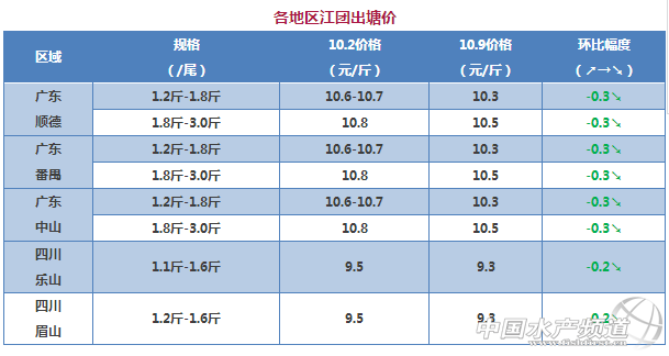中國水產(chǎn)頻道獨家報道, 江團 1、廣東地區(qū)江團本周價格比上周下滑了0.3-0.4元/斤,因為廣東持續(xù)高溫天氣,對水車運輸造成了一定的影響,節(jié)后的消費疲軟也會影響銷量。江團價格從一個月前的11.5元到今天的10.5元,下跌了1元/斤,F(xiàn)在出塘價比較低,部分養(yǎng)殖戶的出魚意愿不高,預(yù)測后期價格不會繼續(xù)下跌了。 2、本周四川樂山與眉山的江團價格與上周價格又下跌了0.2元/斤,主要是現(xiàn)在貨源充足,能滿足市場需求,預(yù)測后期價格也有下滑的趨向。 |