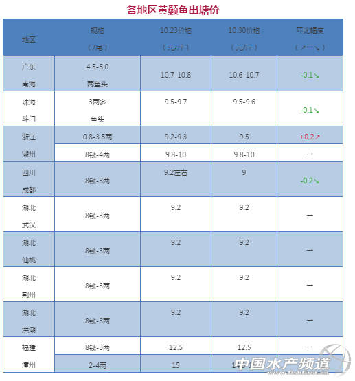 中國水產(chǎn)頻道獨家報道, 文/圖 何氏水產(chǎn)、水產(chǎn)前沿 李靜 黃顙魚 廣東地區(qū)上周黃顙魚價格稍稍下跌,天氣的影響,水車質(zhì)量有了保障,廣東的銷售量開始有了春天回暖的跡象,廣東規(guī)格是以統(tǒng)貨4兩頭的居多,預(yù)測價格依舊是持續(xù)緩慢的下滑。浙江湖州的價格穩(wěn)定。其他地區(qū)價格與上周持平。 備注:黃顙魚因魚頭大小與3兩上大骨所占的具體比例導致成交價格會有一定幅度波動 |