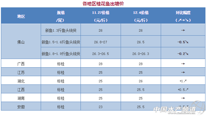 中國水產(chǎn)頻道獨家報道, 文/圖何氏水產(chǎn)、水產(chǎn)前沿李靜 桂花魚 1、在各地本地魚的沖擊下,廣東的銷量沒有多大變化,成為價格無法上揚的主因。上周1.5-1.6斤魚頭統(tǒng)貨的價格最高26.5元/斤,1.8-1.9魚頭統(tǒng)貨價格最高26.3元/斤,1.3魚頭統(tǒng)貨的價格不變。廣東依舊是1.5-1.6斤魚頭統(tǒng)貨為主,本周依然是以魚頭大小定價。市場疲軟,養(yǎng)戶持觀望態(tài)度,預(yù)估這周或持穩(wěn)。 2、湖北與安徽的價格受廣東前段時間漲價影響,本周上浮1-2.5元/斤,其他地方暫時變化不大。 【關(guān)鍵字】:桂花魚 塘頭價 水產(chǎn)養(yǎng)殖 |