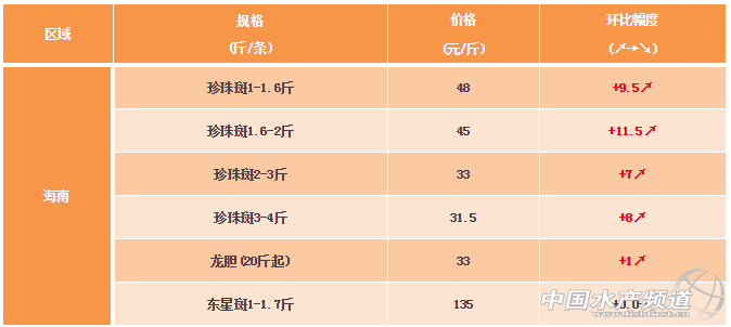 文/ 粵海飼料集團(tuán)、中國(guó)水產(chǎn)頻道 彭曉君 中國(guó)水產(chǎn)頻道原創(chuàng)報(bào)道,海南區(qū)域:目前達(dá)到規(guī)格的成品魚少,市場(chǎng)需求量大,珍珠斑價(jià)格暴漲。 ※上述報(bào)價(jià)可能會(huì)因區(qū)域、規(guī)格、品質(zhì)和時(shí)間等因素的不同而會(huì)產(chǎn)生差異,在此僅供參考。 |