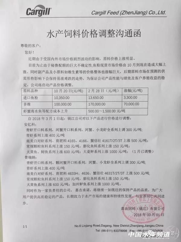 魚粉:最近3個多月漲幅達3300元/噸 中國水產(chǎn)頻道原創(chuàng)報道,據(jù)有關(guān)資料顯示,截止2018年3月1日,超級魚粉報價為13800-14000/噸,較上年同期的11800-12000/噸,上漲了2000元/噸。進口魚粉則在3個多月的時間里由10350元/噸上漲到13650元/噸,漲幅達到3300元/噸。 豆粕:暴漲至3390元/噸 據(jù)貿(mào)易商報價,3月3日豆粕工廠自提價(不含運費)43蛋白,最高已暴漲至3380元/噸,只比昨天的3390元/噸微降10元/噸。 而在春節(jié)期間傳出的中美貿(mào)易壁壘價格戰(zhàn)要打響,特朗普政府將在一個月內(nèi),密集對中國出口到美國的產(chǎn)品進行扣響扳機,大豆很可能是中國瞄準的首個真正目標(biāo)。中國是美豆進口的最大客戶,購買了美國近三分之一價值140億美元的大豆。對此,美國大豆出口商、種植戶對商務(wù)部的決定深感憂慮。無疑,若此成為事實,未來大豆(豆粕)價格在國內(nèi)將更進一步暴漲,中國的料企和養(yǎng)殖戶同樣無不深感憂慮。 菜粕:創(chuàng)10個月來最高位 據(jù)中國證劵報消息,3月1日,菜粕期貨再度飆升,菜粕期貨主力1805合約亦顯著走高,最高上探至2508元/噸,創(chuàng)下近十個月高位。 多維:漲到170000元/噸 截止2018年2月28日,多維價格上漲到170000元/噸,與2017年10月20日的100000元/噸相比,上漲高達70000元/噸。注:這里的是指特種料所用的多維,而普通多維價格沒有那么高。 氨基酸:蘇氨酸停止報價 據(jù)2017的11月13日本公眾號報道,山東諸城東曉70%賴氨酸自提報價5.0元/公斤,98%賴氨酸自提報價9.2元/公斤。 70%賴氨酸及蘇氨酸部分企業(yè)停報 繼98.5%賴氨酸、蘇氨酸企業(yè)提價、停報,貿(mào)易市場價格上漲后,大成70%賴氨酸停報,停報報價4600元/噸。希杰70%賴氨酸停報,停報報價4600元/噸。阜豐、伊品蘇氨酸不接單;梅花98.5%賴氨酸及蘇氨酸報價上調(diào)400元/噸及200元/噸。 微量元素:供應(yīng)緊張 如硫酸亞鐵、硫酸鋅、氧化鋅等微量元素,在不久前也由于原料的緊缺,價格大幅度提高。攀升到一個相當(dāng)高的價位,供應(yīng)緊張...... 日前,鎮(zhèn)江嘉吉、江蘇金康達等料企上調(diào)了多個養(yǎng)殖品種料價,漲幅十分驚人,最高達1000元/噸。據(jù)了解,日前這波飼料漲價屬于華東市場的第二波漲價,第一波漲價則出現(xiàn)在2018年的1月份,包括天邦寧波、淮安澳華、南通巴大等大品牌在內(nèi)。此外,泰州海大已在醞釀全線漲價,淮安天參預(yù)計在3月中旬對草鯽鳊魚料提價150-200元/噸。 3月3日,又一大飼料集團浙江公司發(fā)布漲價重磅消息,對加州鱸魚料、海水魚料、黃顙魚料、淡水魚1系列、鮰魚料、泥鰍料、草魚料、白蝦料、大棚系列料、豐蝦系列料、A系列沼蝦料、河蟹料等進行了價格上調(diào),同樣,漲幅最高達1000元/噸。按受訪企業(yè)要求,我們暫不公布具體企業(yè)名稱。 漲價信息具體如下: 由于原料價格持續(xù)上漲,為保障產(chǎn)品質(zhì)量,經(jīng)公司研究決定,對產(chǎn)品價格做如下調(diào)整: 魚料: 加州鱸魚料上調(diào)1000元/噸; 海水魚料上調(diào)600元/噸; 黃顙魚料上調(diào)500元/噸; 淡水魚1系列、鮰魚料、泥鰍料,上調(diào)300元/噸; 草魚料上調(diào)200元/噸; 蝦蟹料: 白蝦料上調(diào)500元/噸; 大棚系列料上調(diào)600元/噸; 豐蝦系列料、A系列沼蝦料,上調(diào)800元/噸 河蟹料上調(diào)300-500元/噸。 具體價格以公司價格為準,價格調(diào)整從2018年3月3日開始執(zhí)行。 感謝各經(jīng)銷商和養(yǎng)殖戶朋友們的理解和支持! 浙江**飼料有限公司 2018年3月2日 目前,公司相關(guān)人士已證實今日上調(diào)飼料價格的消息并表示,原料行情普遍上漲,預(yù)計各大小料企都會漲,因為成本會吃不消,如果原料漲飼料不漲都是對客戶養(yǎng)殖不負責(zé)。 附:其他公司漲價通知 淮安市澳華農(nóng)牧有限公司漲價通知 尊敬的合作伙伴: 由于當(dāng)前原料價格大幅度上漲,為保證產(chǎn)品質(zhì)量,經(jīng)公司研究決定于2018年1月15日零時對的產(chǎn)品價格在原銷售價格基礎(chǔ)上進行調(diào)整,具體如下: 蟹料、龍蝦料: 1、膨化蟹安康1#、顆粒蟹安康680#上調(diào)600元/噸; 2、膨化蟹安康2#、顆粒蟹安康681#上調(diào)400元/噸; 3、河蟹料660#上調(diào)500元/噸; 4、河蟹料:661#、663#、664#上調(diào)300元/噸; 5、膨化蟹料上調(diào)300元/噸; 6、龍蝦料8663#上調(diào)300元/噸; 白蝦料: 1、鉑金版蝦安康上調(diào)1000元/噸; 2、蝦安康880#、881#、882#上調(diào)800元/噸; 2、白蝦料861B#、862#上調(diào)500元/噸; 3、蝦配合料8612#上調(diào)300元/噸。 特此通知!感謝您對淮安澳華的支持! 淮安市澳華農(nóng)牧有限公司 2018年1月15日 南通巴大飼料有限公司漲價通知 由于原料價格持續(xù)猛漲,不漲價就難以保障產(chǎn)品質(zhì)量!為保證產(chǎn)品質(zhì)量,強化養(yǎng)殖效果,經(jīng)公司研究決定,對蝦蟹料產(chǎn)品進行價格調(diào)整,具體如下: 一、蝦料: 1、蝦肝強漲價800元/噸; 2、寶鼎系列、8000系列蝦料漲價500元/噸; 3、白蝦、沼蝦料8020漲價400元/噸;白蝦、沼蝦料8021、8022、小龍蝦料1#、2#漲價300元/噸。 4、沼蝦蝦肝強0#料漲價800元/噸、沼蝦1#、2#料漲價500元/噸。 二、蟹料: 1、蛋白38%(含38%)以上產(chǎn)品漲價500元/噸; 2、蛋白36%(含36%)以下產(chǎn)品漲價300元/噸。 三、漲價時間:2018年1月15日24:00。 四、魚料產(chǎn)品以通知為準! 南通巴大飼