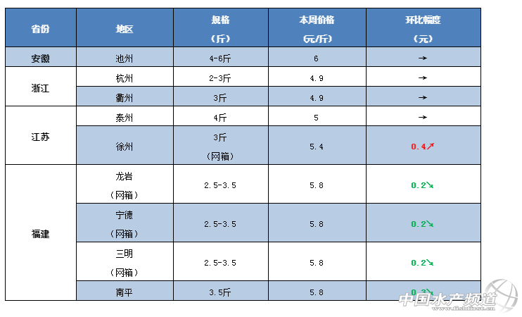 3.近期,華南草魚行情相對較好,珠三角大草魚行情繼續(xù)走高,廣西也有部分地區(qū)出現(xiàn)上漲。本周中山部分地區(qū)5斤草魚上漲0.6元/斤,最新報價6.8-7元/斤;肇慶統(tǒng)鯇漲了0.2元/斤,最高賣到4.5元/斤;廣西桂林地區(qū)草魚價格出現(xiàn)上漲,2斤草魚塘頭賣到5.5元/斤。不過,華中地區(qū)草魚整體行情不好,魚不好賣,整體價格繼續(xù)有下滑趨勢。最近,福建魚車普遍到江西拉魚,本地賣魚壓力增大,本周福建地區(qū)草魚價格出現(xiàn)下滑,目前3斤草魚整體報價在5.5-5.8元/斤。
