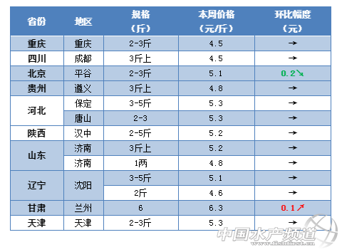 河北:本周河北地區(qū)的草魚行情沒有出現(xiàn)太大變化。據(jù)養(yǎng)殖戶介紹,目前唐山地區(qū)3斤以上的草魚最新塘頭價(jià)賣到5-5.1元/斤。(