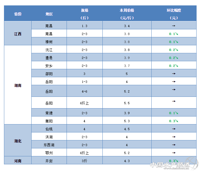 河南:本周河南地區(qū)的草魚(yú)行情也是出現(xiàn)了小幅下滑。從養(yǎng)殖戶了解到,目前鄭州、開(kāi)封等地區(qū)3斤的草魚(yú)最新塘頭價(jià)只賣到4.3元/斤,較上周下滑0.3元/斤。