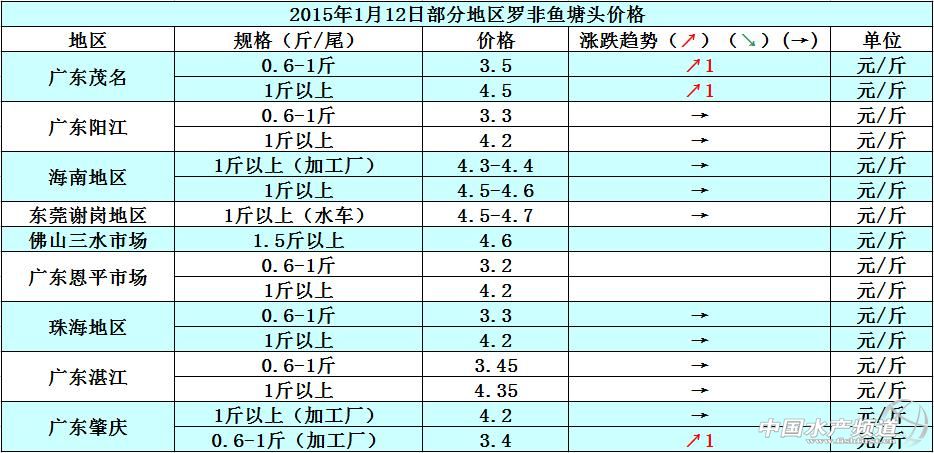 據(jù)悉,本周各地的羅非魚價(jià)格相比上周基本持平,主要原因是羅非魚出塘量少,整體交易量差,致使魚價(jià)無法上漲,最近加工廠的訂單收購量不大,預(yù)計(jì)后市魚價(jià)將會(huì)維持現(xiàn)狀;浳髅貐^(qū)養(yǎng)殖的羅非魚絕大部分會(huì)選擇過冬,所以元旦之后的魚價(jià)會(huì)稍有漲幅,粵西其他地區(qū)的魚價(jià)則保持平穩(wěn)。因?yàn)橛唵紊俚脑,羅非魚加工廠近期的收購量不大,現(xiàn)在很多加工廠收購羅非魚是為了填充庫存,想趁魚價(jià)低的時(shí)候多收一些原料,但是養(yǎng)殖戶見到魚價(jià)低迷賣魚意愿就不大,但多數(shù)加工廠還是抱著可有可無的心態(tài)去收購。具體價(jià)格如下: