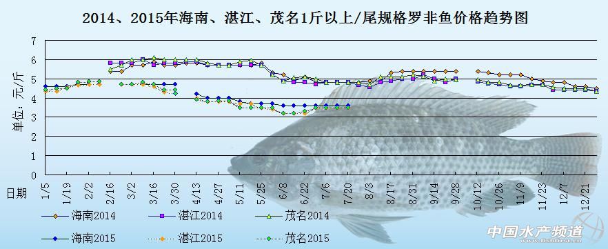 中國水產(chǎn)頻道原創(chuàng)報道,以下是海南地區(qū)、湛江地區(qū)、茂名地區(qū)2014年和2015年1斤以上/尾規(guī)格羅非魚的價格趨勢圖。圖中可以很明顯的看出,2015年的羅非魚價格跟2014年的羅非魚價格相比相差了1元左右/斤,整體價格差異很大。
