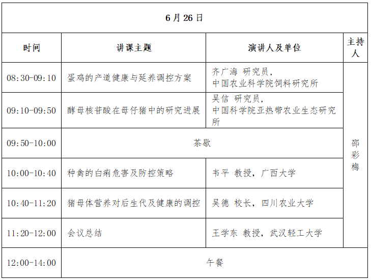 關(guān)于舉辦“第六屆動物早期營養(yǎng)與健康應(yīng)用技術(shù)研討會” 暨“‘首屆酵母與生命’圖文大賽” 第二輪通知 各有關(guān)單位: 無抗飼料養(yǎng)殖已成常態(tài),動物生長性能、群體健康、繁殖性能均面臨多重考驗和挑戰(zhàn)。自2020年7月1日飼料禁抗以來,酵母活性物質(zhì)的研究和應(yīng)用已成為行業(yè)熱點。酵母富含功能性小肽、氨基酸、核苷酸、酵母葡聚糖、微量元素、糖蛋白,及其代謝產(chǎn)生的谷胱甘肽、特種酶類、γ-氨基丁酸、有機(jī)酸、生物腐殖酸等酵母活性物質(zhì),具有促進(jìn)腸道發(fā)育、增強(qiáng)免疫、緩解氧化應(yīng)激、改善生產(chǎn)性能等營養(yǎng)調(diào)控功能。廣泛應(yīng)用于動物早期營養(yǎng)、無抗飼料及天然美味肉品生產(chǎn)等領(lǐng)域。 面對行業(yè)高效生產(chǎn)的需求,由中國畜牧獸醫(yī)學(xué)會主辦,安琪酵母股份有限公司承辦的“第六屆動物早期營養(yǎng)與健康應(yīng)用技術(shù)研討會”定于2021年6月24日-26日在湖北省宜昌市舉行,屆時將邀請畜牧業(yè)的專家及企業(yè)代表,共同探討酵母活性物質(zhì)在動物消化、代謝、繁殖等方面的研究和應(yīng)用。 同時,本屆大會除設(shè)置常規(guī)報告議程外,還將新增設(shè)置“‘酵母與生命’圖文大賽”頒獎和展示議程。 現(xiàn)將有關(guān)事項通知如下: 一、主辦單位:中國畜牧獸醫(yī)學(xué)會 二、承辦單位:安琪酵母股份有限公司 北京博亞和訊文化傳媒有限公司 三、贊助單位:五峰赤誠生物科技股份有限公司 四、時間地點 現(xiàn)場報到:2021年6月24日 研討會:2021年6月25日-26日 會議地點:湖北宜昌桃花嶺飯店 五、交通指南(見附件一) 六、演講嘉賓(專家報告以當(dāng)日安排為準(zhǔn))