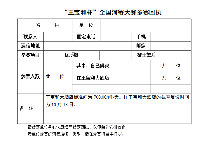 5、要求送展的河蟹于11月3日8:30以前送至河蟹評比會會務(wù)組,11月3日11:00以后送交的河蟹不參加評比。
