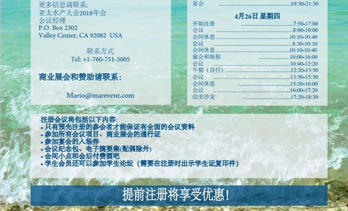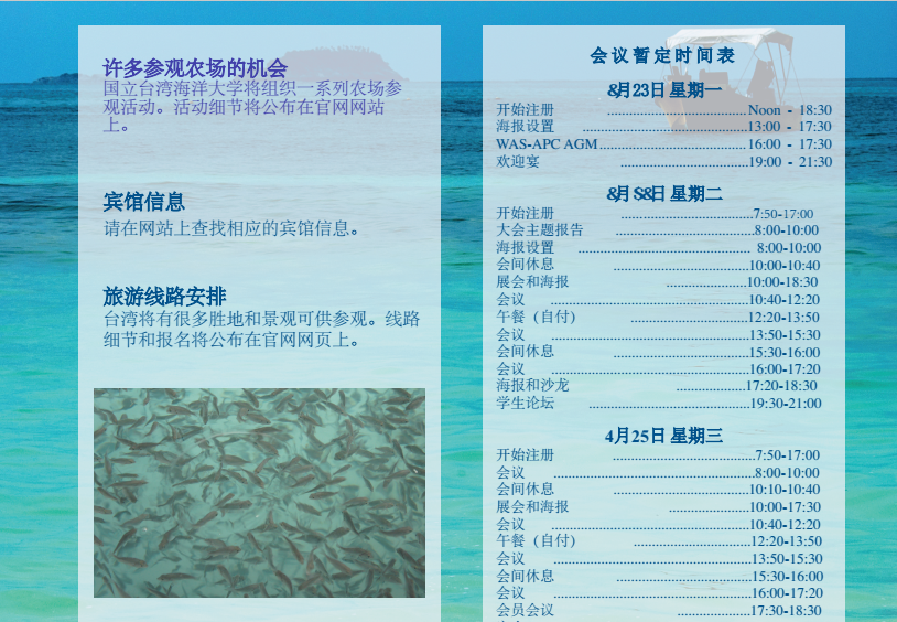 亞太水產(chǎn)大會(huì)2018年會(huì)是學(xué)習(xí)最新的水產(chǎn)養(yǎng)殖技術(shù),并在商業(yè)展會(huì)中看到來(lái)自世界各地的展品,并享受臺(tái)灣豐富的旅游景點(diǎn)。