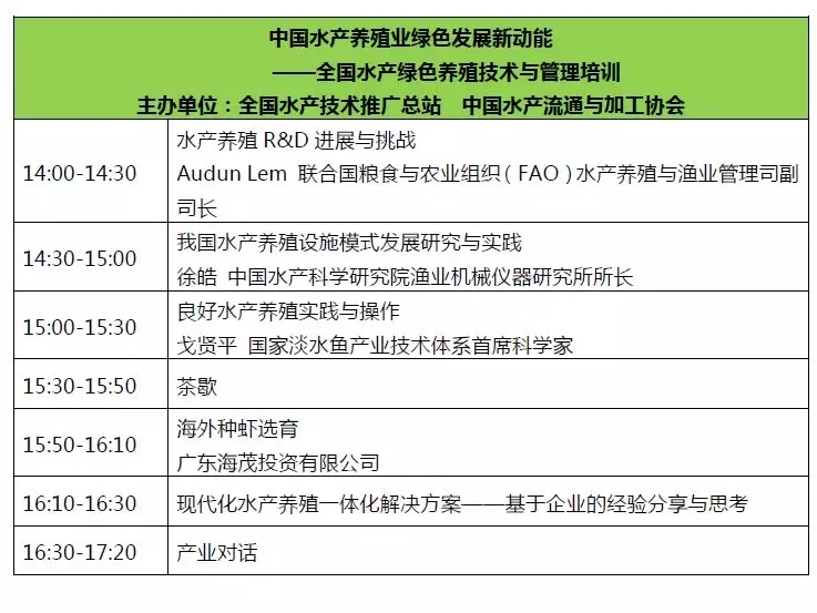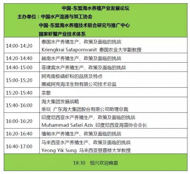 2019年5月17 -18日農(nóng)業(yè)農(nóng)村部水產(chǎn)養(yǎng)殖綠色發(fā)展系列活動之“2019全球水產(chǎn)養(yǎng)殖大會”和“第十一屆中國蝦產(chǎn)業(yè)發(fā)展研討會”將在珠海國際展覽中心盛大召開。 指導(dǎo)單位 農(nóng)業(yè)農(nóng)村部漁業(yè)漁政管理局 全國水產(chǎn)技術(shù)推廣總站 中國水產(chǎn)學(xué)會 主辦單位 中國水產(chǎn)流通與加工協(xié)會 中國-東盟海水養(yǎng)殖技術(shù)聯(lián)合研究與推廣中心 國家蝦蟹產(chǎn)業(yè)技術(shù)體系 戰(zhàn)略合作伙伴 廣東恒興集團有限公司 協(xié)辦單位 美國大豆出口協(xié)會 支持單位 廣東海茂投資有限公司 挪威阿克海洋生物有限公司 廣東海大集團股份有限公司 技術(shù)支持單位 國家大宗淡水魚產(chǎn)業(yè)技術(shù)體系 國家海水魚產(chǎn)業(yè)技術(shù)體系 國家貝類產(chǎn)業(yè)技術(shù)體系 國家藻類產(chǎn)業(yè)技術(shù)體系 國家特色淡水魚產(chǎn)業(yè)技術(shù)體系 2019全球水產(chǎn)養(yǎng)殖大會 時間:5月17日 地點:珠海國際會展中心,珠海廳1+2
