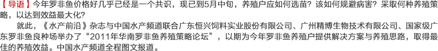 | 10:00-10:30 | 羅非魚良種的選擇及其高效養(yǎng)殖技術(shù) | 國(guó)家級(jí)廣東省羅非魚良種場(chǎng):葉衛(wèi) 場(chǎng)長(zhǎng) | |||