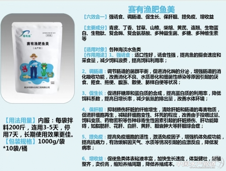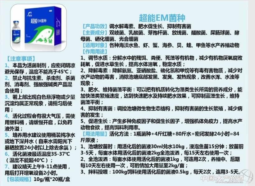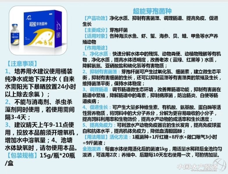 在放苗之前,要做好清塘消毒工作,殺滅寄生蟲卵,降低寄生蟲病的發(fā)生率。在魚苗放苗后2-3星期是寄生蟲感染的高發(fā)期,所以放苗之后,可使用本草驅(qū)蟲凈拌料內(nèi)服預防寄生蟲,每月兩次,每次3-5天。平時使用肥魚美等產(chǎn)品增強體質(zhì)和強化機體免疫力,同時配合超能丁酸菌種、金肝利膽和白便速治等產(chǎn)品做好肝腸保健工作。在日常管理中,加強水體自凈能力(保持一定肥度,培菌強化有機分解速度等,如超能EM菌種、超能乳酸菌種、超能芽孢桿菌等),降低有機污染(合理投喂,選擇高質(zhì)量飼料,做好排污工作等),維護生態(tài)平衡(維持菌相、藻相、蟲相等平衡,使用如超能EM菌種、超能乳酸菌種、超能芽孢桿菌、草本驅(qū)蟲凈等),增強魚類體質(zhì)(提高攝食消化率,強化肝膽功能,提升免疫力,如肥魚美、超能丁酸菌種、超濃縮乳酸菌、液肽美、金肝利膽、白便速治等)等,并根據(jù)養(yǎng)殖池塘實際情況,對各種影響因素進行綜合判斷,以便采取針對性措施。  【主要成分】 洋槐花、烏梅、南瓜子、貫眾、檳榔、苦參等 【適用對象】 各種海淡水魚、蝦蟹、甲魚、蛙、海參等水產(chǎn)養(yǎng)殖動物 【作用用途】 清熱止血、殺蟲利尿。 1、麻痹寄生蟲的神經(jīng)系統(tǒng),使蟲體失去附著力和活力,起到明顯驅(qū)蟲作用; 2、驅(qū)殺和抑制體內(nèi)外寄生蟲及水中游離寄生蟲,如小瓜蟲、斜管蟲、車輪蟲、指環(huán)蟲、三代蟲、粘孢子蟲、纖毛蟲等; 3、本品具有天然性、低毒、無抗藥性、無有害殘留、無污染等優(yōu)點。 【用法用量】 內(nèi)服:每袋拌料80斤,每日一次,預防量減半,連用5-7天。 【包裝規(guī)格】 200g/袋*40袋/件 廠家直銷電話:15617893695(微信同步)