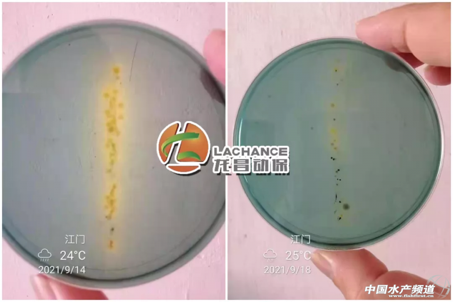 案例 廣東都斛鎮(zhèn)莊老板6畝池塘,放對(duì)蝦苗18萬,放苗50天開始出現(xiàn)慢料,加料加不上去,水質(zhì)檢測也很好,氨氮亞鹽也不高,藻相也不錯(cuò)。提料臺(tái)蝦活力較差,有部分蝦出現(xiàn)了空腸,喂料3個(gè)小時(shí)都吃不完。 9月13日經(jīng)檢測弧菌較多,部分腸道鏡檢有黑斑,沒有纖毛蟲。對(duì)蝦體色微微發(fā)紅,有斷須,判斷對(duì)蝦慢料最主要原因弧菌誘發(fā)對(duì)蝦腸炎。 9月13日用龍昌樂暢和活力多拌料,樂暢4克/公斤料,活力多8克/公斤料,連續(xù)使用5天拌料內(nèi)服。 9月17日回訪,吃料明顯加快,每餐多加5斤料,體色明顯好轉(zhuǎn),活力增強(qiáng),吃料正常,莊老板非常滿意使用效果,檢測對(duì)蝦體內(nèi)弧菌明顯減少。 總結(jié): 活力多和樂暢作為精油和酸化劑,樂暢具很強(qiáng)滲透性和穿透性,可以裂解弧菌細(xì)胞膜,活力多可以游離出甲酸,小分子有機(jī)酸抑制弧菌效果快,強(qiáng)強(qiáng)聯(lián)合效果更好。抑制弧菌促進(jìn)對(duì)蝦腸道消化,同時(shí)促進(jìn)對(duì)蝦硬殼,提高對(duì)蝦活力。所以對(duì)蝦 養(yǎng)殖中后期,內(nèi)服樂暢和活力多抑制弧菌促進(jìn)吃料效果好。