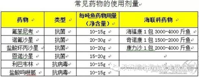 抗生素類藥物多頻次使用,有的一天連續(xù)3餐投喂抗生素。核心原因抗生素用藥劑量不足,養(yǎng)戶多半使用抗生素按照一包恩諾沙星拌多少包飼料來計算,殊不知那是規(guī)定在3%或5%投餌率之下的用藥量!正確的拌藥劑量應(yīng)該依據(jù)魚的體重來計算用藥量,達到藥物在魚體內(nèi)的濃度,才有治療效果,否則抗藥性越來越強,常見治療藥物用藥劑量如下: