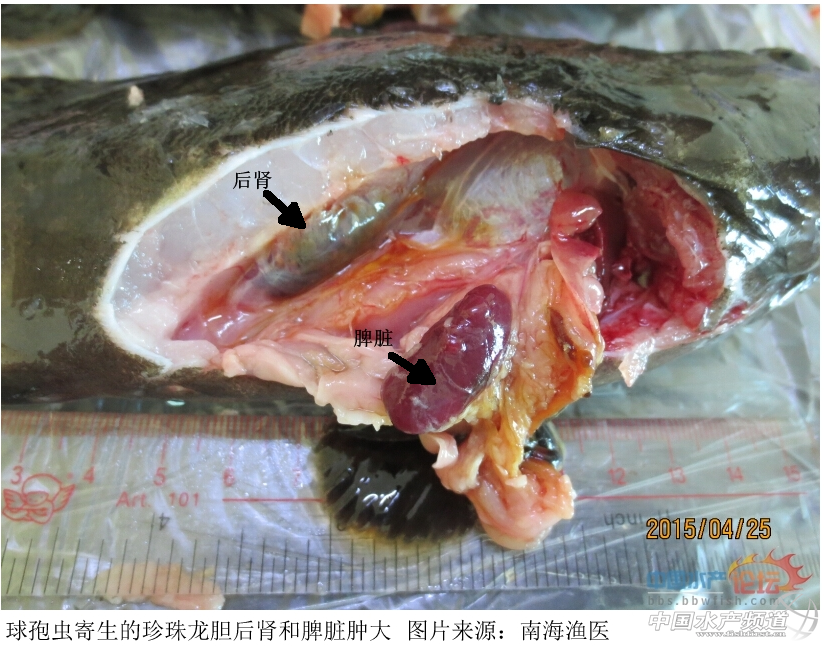 此外,南海漁醫(yī)在青斑腎小管中也發(fā)現(xiàn)了球孢蟲(chóng),同樣表現(xiàn)出后腎、脾腫大和肝臟有白色結(jié)點(diǎn)。詳見(jiàn)報(bào)道:石斑:神啦!救救我吧!。虾O醫(yī))
