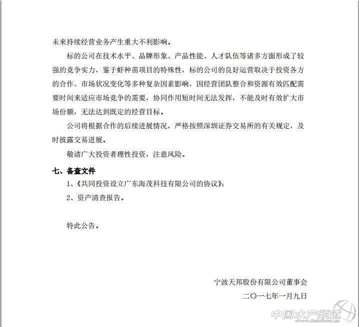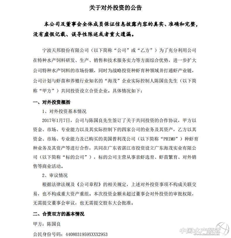2017年1月8日,在熱鬧非凡的天邦股份20周年慶的年會上,來至全國各地900余位嘉賓同時聽到了一個好消息:1月7日,寧波天邦股份有限公司(以下簡稱天邦)與陳國良簽訂共同投資合作協(xié)議,天邦將注資5000萬,與陳國良家族控制的四家公司共同在廣東湛江投資設(shè)立一家合資公司,希冀進一步擴大天邦在特種水產(chǎn)飼料市場份額,打通蝦產(chǎn)業(yè)鏈。