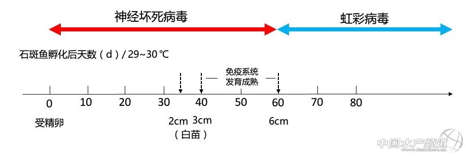 硬骨魚的免疫系統(tǒng)主要包括胸腺、脾臟、頭腎,以及粘膜組織內(nèi)彌散的一些免疫區(qū)域。胸腺是最為重要的特異性免疫器官,其主要細胞類型是分泌抗體的淋巴細胞。石斑魚是從什么時期開始有特異性免疫能力呢?臺灣學者的研究結(jié)果是40天(約4~5cm)以上(參考:石斑魚產(chǎn)業(yè)發(fā)展:安全繁養(yǎng)殖技術(shù)—鄭金華 | 行政院農(nóng)委會水產(chǎn)試驗所東港生技研究中心),瑪拉巴石斑魚(E. malabaricus)在40天以后胸腺發(fā)育完全成熟,點帶石斑魚(Epinephelus coioides)則更久,要2個月以上。神經(jīng)壞死病毒主要在60天以前感染,這段時間多數(shù)魚苗只有非特異性免疫,還不能產(chǎn)生抗體抵抗病毒,只能通過隔離病毒來預防,也就是所謂的SPF苗(Specific Pathogen Free,無特定病原),但真正要做到不接觸病原很難,神經(jīng)壞死病毒幾乎無處不在,既能從親本垂直傳播,也能通過海水和各種生物餌料水平傳播,這也就是為什么神經(jīng)壞死病毒病死亡率極高的原因。同樣的,虹彩病毒導致的黑身相對可控,死亡率較神經(jīng)壞死病毒低,原因是虹彩病毒主要在5cm后爆發(fā),此時免疫功能已經(jīng)初步形成,魚苗能夠產(chǎn)生抗性存活下來。