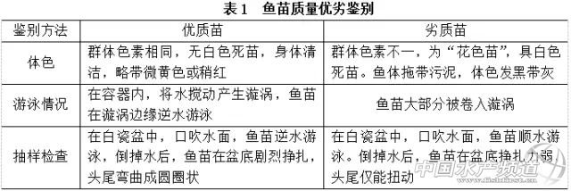 魚苗因受魚卵質(zhì)量和孵化過程中環(huán)境條件的影響,體質(zhì)有強有弱,這對魚苗的生長和成活帶來很大影響。生產(chǎn)上可根據(jù)魚苗的體色、游泳情況以及掙扎能力來區(qū)別其優(yōu)劣。鑒別方法見表1。